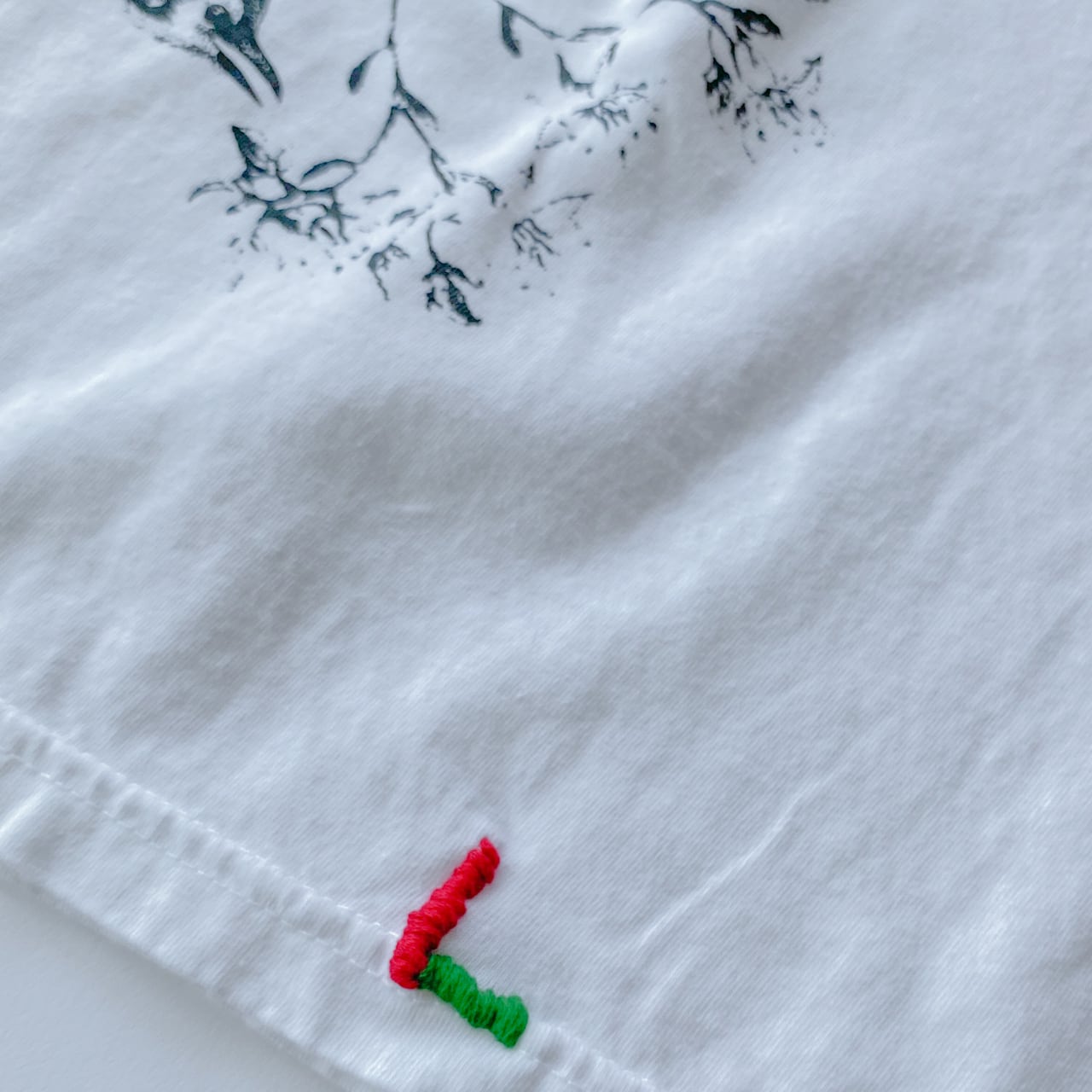 首元には丁寧な手かがり、裾には「L」の手刺繍を施し、
